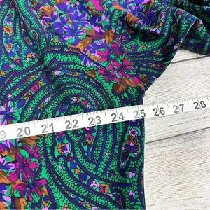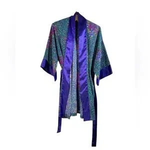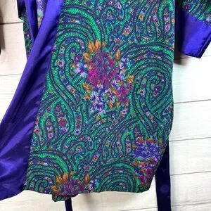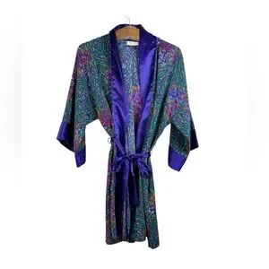 In great condition. Green/purple multicolor with floral paisley pattern. Open front. Waist tie belt. Satin robe. Missing front loop as pictured. 100% polyester. Refer to pictures for measurements. From smoke-free/pet-free home.