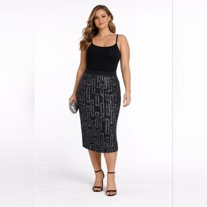 This Vivendi midi skirt features an intricate black and silver geometric sequin design that catches the light beautifully without overwhelming the look. The stretchy elastic waistband makes it comfortable and flattering, while the midi length keeps it polished and versatile.