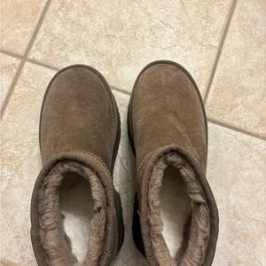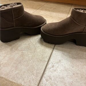 Cozy UGG boots with soft shearling lining. Ideal for warmth and comfort. Ultra platform. A light brown/charcoal grey color. Size 8. Never worn.