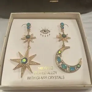 Eye Candy LA Blue Celestial Moon & Star Drop Earrings Gold. Condition is brand new in box.