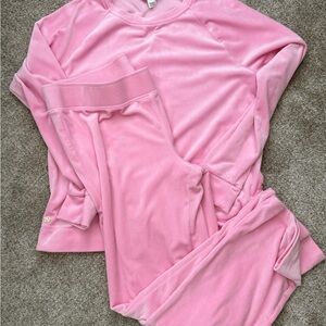 Soft and cozy pink jogging set. Includes long-sleeve top and pants. Perfect for lounging. Top is large