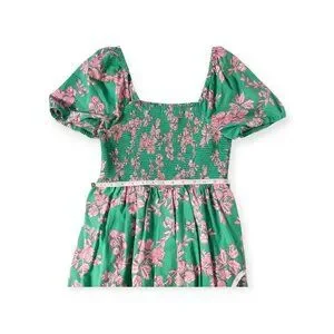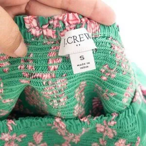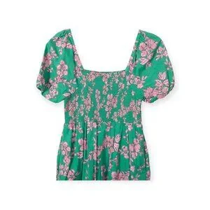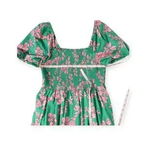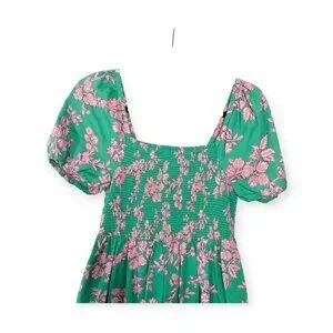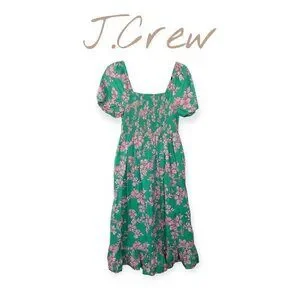 This J.Crew dress embodies vibrant elegance with its lush green backdrop adorned by delicate pink floral prints. The smocked bodice ensures a flattering fit, while the puff sleeves and flowing midi length exude timeless charm. Crafted from breathable cotton, this dress is a stylish choice for warm weather, blending comfort and sophistication effortlessly.