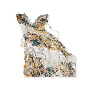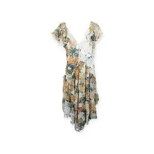 floral lace dress, asymmetric hem dress, midi dress size 4, silk summer dress, lace midi dress, designer dress, Zimmermann floral, multicolor dress, romantic midi dress, V-neck dress, flutter sleeve dress, luxury dress, lightweight midi dress