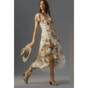 This show-stopping high-low maxi dress from Anthropologie features a dreamy ivory floral print with romantic ruffle details and intricate white crochet lace paneling. Designed with a flattering V-neckline, flutter sleeves, a tassel tie-back closure, and soft viscose fabric, it’s the perfect piece for weddings, vacations, or brunch.
