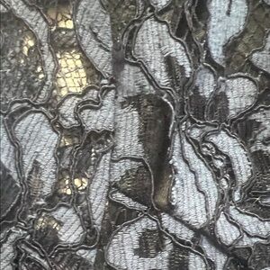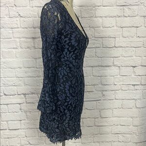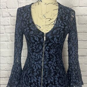 Chic blue and black lace dress with floral design. Ideal for elegant outings. Full zips and see through upper back.Size 8 but runs small. No stretch.