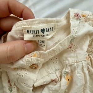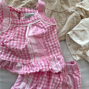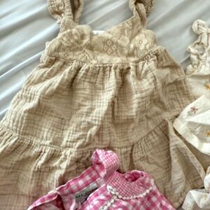 Bundle of baby outfits includes: 2 short and top sets & a cream dress