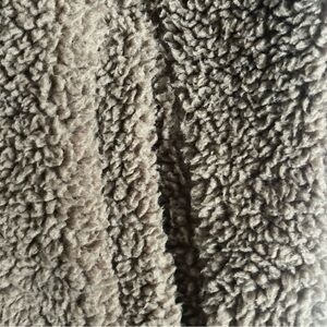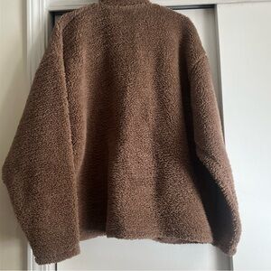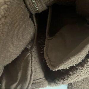 Cozy brown fleece jacket. Features front zipper and pockets. Stylish and warm.