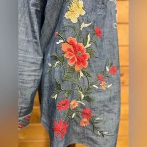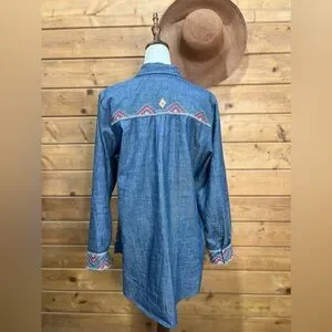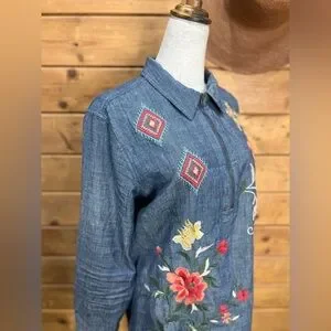 Johnny Was Zipup Shirt Tunic Denim Blue Embroidered Floral Horse Equine Medium