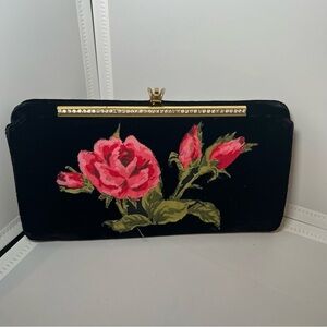 Vintage Velvet Black Clutch With Roses Glued On Sparkly Stones