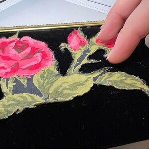 The clutch is in a great shape. The rose design is peeling a little in some areas as you can see in pictures. This was made in the USA and I can’t quite make out the brand. See pictures.