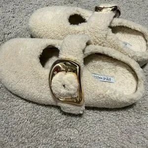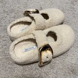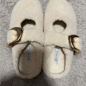 Steve Madden Sherpa Mules. Stylish gold buckle accent. Ideal for comfort. Worn around house once and too big!