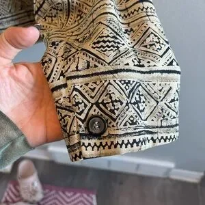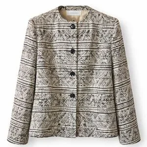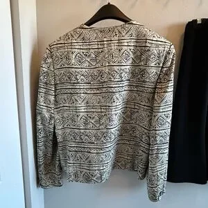 Chic and timeless Jones New York blazer featuring a bold black and white tribal / geometric print. Crafted with a 100% silk lining for a luxe feel and polished drape. A structured yet wearable piece that transitions effortlessly from workwear to elevated casual looks.