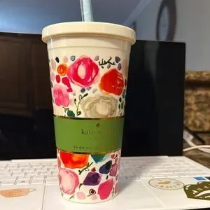 The item in the image is a Kate Spade New York Golden Floral Tumbler with Straw. It is an insulated tumbler designed for cold beverages, with a capacity of 20 ounces. The tumbler features a floral pattern in gold foil and is made of BPA-free, phthalate-free, and lead-free acrylic. The tumbler has a double-wall design to keep drinks cold and prevent condensation. It also has a twist-off lid and a reusable straw.