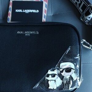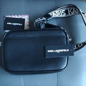 Chic black belt bag with signature Karl Lagerfeld accents. Features adjustable strap and sleek design.