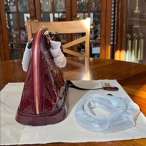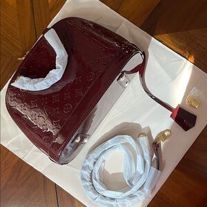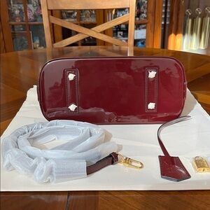 Chic Burgundy Patent Leather Satchel Bag. Such a gorgeous bag!! Features iconic monogram pattern. Ideal for a stylish statement.