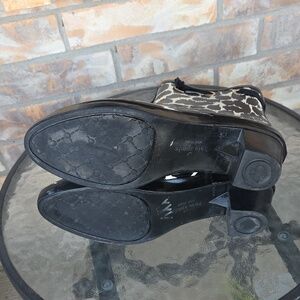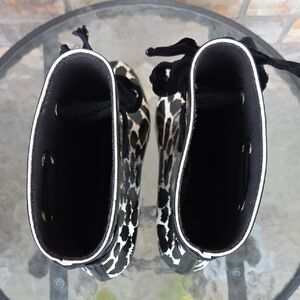 KATE SPADE New York Women's Ankle Rain Boots in good condition. Black and ivory/white animal leopard print on waterproof rubber. Stylish bow near the top of the shaft and a modest block heel, typically measuring around 2 inches. Insoles are loose which does not affect the wear of the boots.