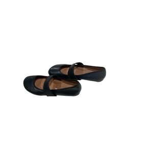 Gentle Souls by Kenneth Cole black leather Mary Jane flats offer a blend of sophisticated style and signature comfort. These shoes feature a smooth leather upper with a distinctive scalloped-edge elastic strap for a secure fit and a touch of feminine detail. Designed with a cushioned footbed and a flexible rubber outsole, they provide all-day support suitable for professional settings or casual outings. The minimalist ballet-inspired silhouette ensures versatile pairing with dresses, trousers, or skirts.