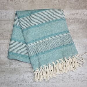 Green / blue aqua color. Striped with fringe tassels. Cute spring summer colors.