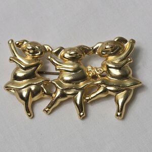 This exquisite gold tone brooch features a charming trio of ballerinas, perfect for adding a touch of elegance to any outfit. Ideal for dance enthusiasts and jewelry lovers alike.