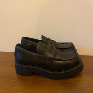 Sleek black leather loafers. Chunky sole for added style. Perfect for casual wear.