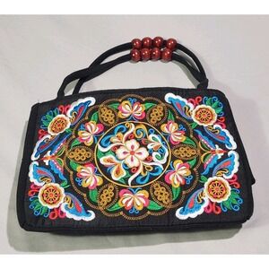 Colorful Embroidered Clutch Purse 2 Zip Pouches Florals Design Beaded Handle