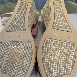 Elegant pink espadrille wedges by Soludos. Features a woven heel and ribbon tie. Perfect for casual outings.