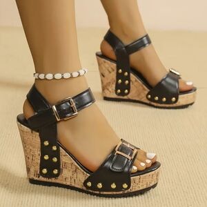 🐎NEW! Black Cork Wedge Sandals Sz 6