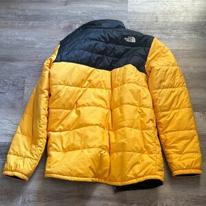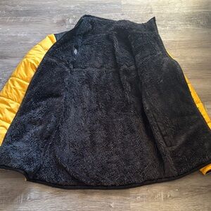Warm and durable jacket by The North Face. Features a bold yellow and black design. Ideal for chilly days. Has no tag size let me know of measurements.
