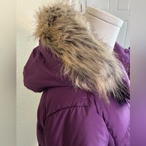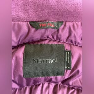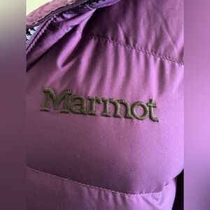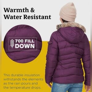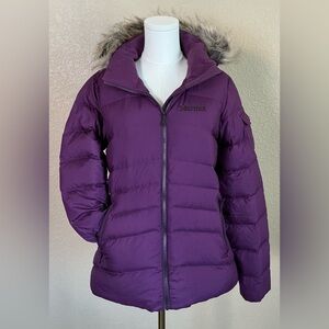 Marmot Ithaca 700 fill down jacket in plum, size medium. RDS certified, zip-off hood with removable faux fur, water resistant and seriously warm. New without tags, perfect condition.
