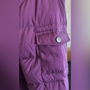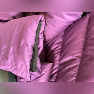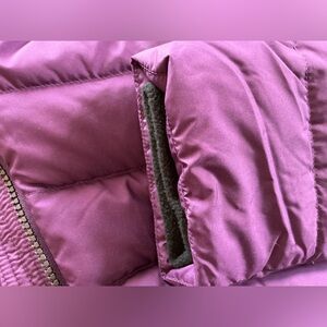 It is a gorgeous deep plum / eggplant purple with removable faux fur trim and zip-off hood. It’s lightweight but seriously warm thanks to 700 fill power down insulation and RDS (Responsible Down Standard) certification.