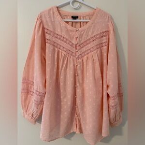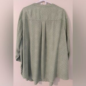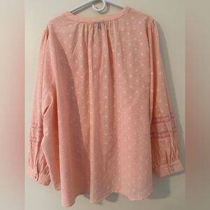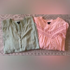 Preowned but both in excellent condition. Mint green dotted with adjustable sleeves. Peach colored cotton button down with long peasant sleeves. Both are Size 5. Measurements are approximate.
