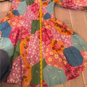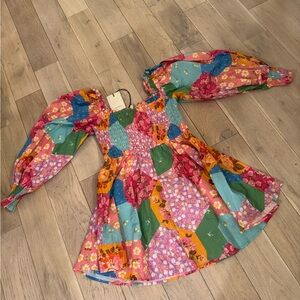 Charming dress with a floral patchwork design. Features smocked bodice and ruffled sleeves. Ideal for a vibrant look.