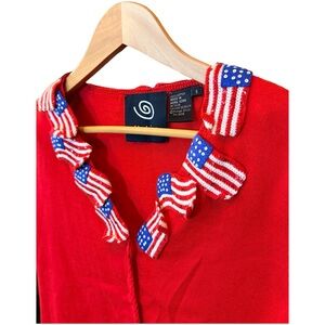 Adorable vintage Michael Simon red knit cardigan featuring crocheted American flags around the neckline with subtle sequin sparkle for extra charm. Beautiful detailed craftsmanship throughout — including crocheted buttons, scalloped lace trim at the sleeves and hem, and full button-front closure. A timeless statement piece, perfect for holidays, events, or adding vintage flair to any outfit. Wear it buttoned or open.