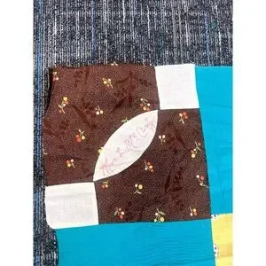The top layer of the quilt is finished before it is layered with batting and backing. The quilt top has a teal border and features three rows of two squares each. Each of the six squares is made of smaller, multi-colored fabric patches. The quilt is sometimes called a memory quilt, with signatures or names written on some of the patches.