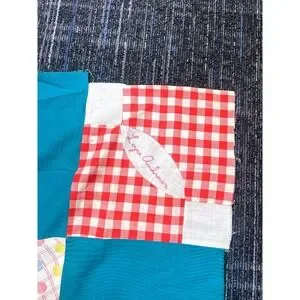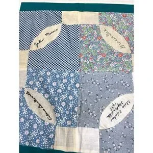 This is a vintage quilt top made by my grandmother. She never got the opportunity to finish it. It's a friendship blanket. It has various names with various signatures by different individuals Some are hand stitched and some are embroidered.