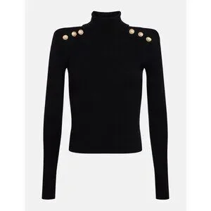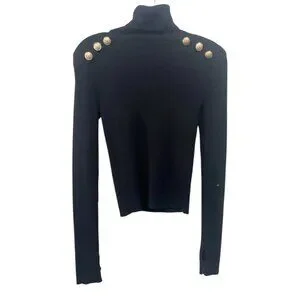 • Features: Turtleneck, puffed/structured shoulders, gold-tone embossed dome buttons, long sleeves with thumb holes, pullover style, shoulder pads