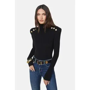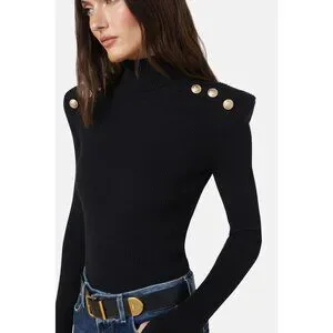 Chic and sophisticated, the Reeves Turtleneck Sweater by L'Agence delivers effortless Parisian polish with modern California cool. Crafted in a soft premium ribbed knit, this fashion-forward black sweater features exaggerated strong shoulders adorned with a trio of luxe gold embossed dome buttons for a statement finish. The close-fitting silhouette drapes beautifully to the high hip, creating a sleek, tailored look. Long sleeves are finished with thumb holes for added edge and comfort. Imported. Style #8948TXN. MSRP $400.