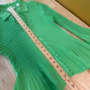 Lightweight pleated blouse in a vibrant lime green hue features a sophisticated accordion texture throughout. Designed with a classic collar and a feminine ruffled placket, the top is finished with elegant bell sleeves and a subtle peplum hem. The sheer polyester fabric offers a breezy, ethereal feel, while the hidden button-down closure maintains a clean, polished silhouette.