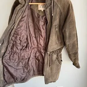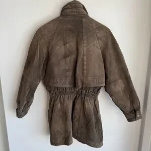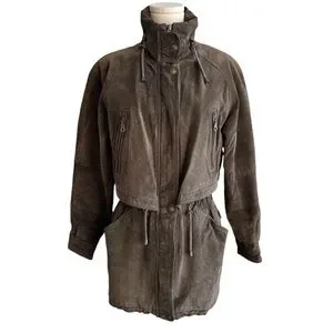 Vintage 80s Brown Suede Utility Coat Womens S Leather Longline Safari Distressed