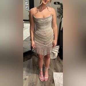 I bought this beaded corset mini dress as a second wedding look option but didn’t end up wearing it! Comes with original nude corset strings and nude boy shorts to wear underneath! The corset is nice because it allows the dress to be made tighter looser depending on bust size. Perfect for homecoming, prom, formal, or second wedding look. Shimmer in this elegant beaded fringe dress, perfect for any special occasion. The intricate beadwork adds a touch of glamour.