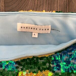 Such a fun sequin set! The skirt liner has some self tanning stains lol but it has been cleaned! Skirt has some stretch.