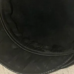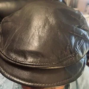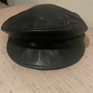 This genuine leather motorcycle cap, with its flat top and structured visor, was purchased in the late 1990’s at the Harley Davidson store. As a vintage style, it has a leather band across the front, held by small metal buttons, a visor measuring approximately 2 ¼” in length, and an interior lined with leather for comfort.