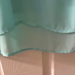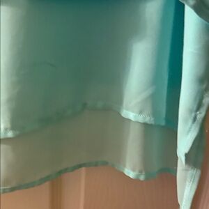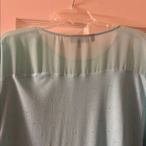 Elegant aqua blouse with sheer layers. Subtle embellishments add sparkle. Ideal for stylish layering.