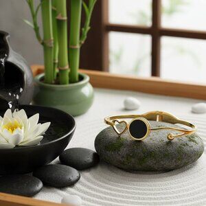 bangle bracelet | 18K gold plated | stainless steel jewelry | minimalist jewelry | modern aesthetic | open heart charm | black circular charm | tarnish resistant | hypoallergenic | everyday wear | stacking bracelet | dainty jewelry | chic accessories | neutral tones | contemporary design | gift for her | anniversary gift | birthday present | spring fashion | casual chic | elegant styling | timeless piece | durable jewelry | water resistant | gold bangle | charm bracelet | slide clasp | secure closure | boutique jewelry | luxury finish | affordable luxury | minimalist luxe | zen aesthetic |