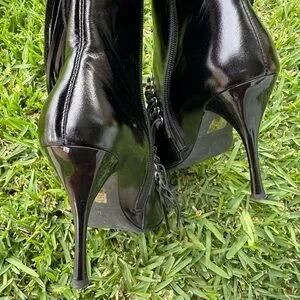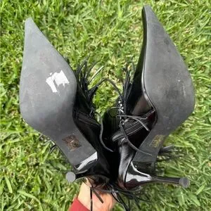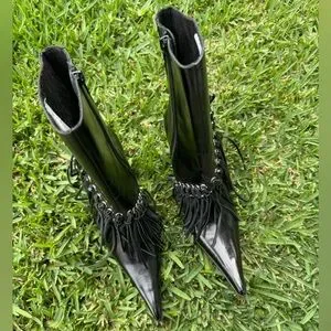 Sleek black boots with bold fringe detail. Perfect for a statement look.
