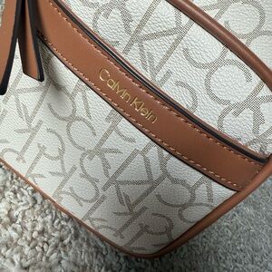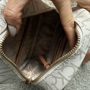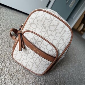 Elegant backpack with iconic monogram pattern. Features cream and brown tones. Compact and stylish design.