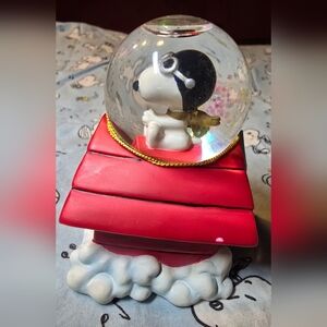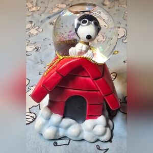 Charming Snoopy snow globe featuring a vibrant red doghouse. He ready to fly like only the "Red Baron" can.