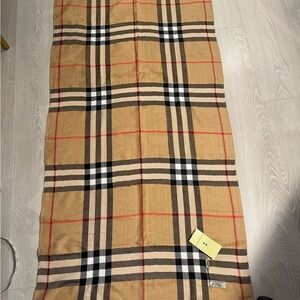 Brand new with tags, Stylish Burberry scarf with iconic check pattern. Features tan and red hues. Perfect for a sophisticated look. 100% Cashmere. Measurements are approx. 72” by 28”.