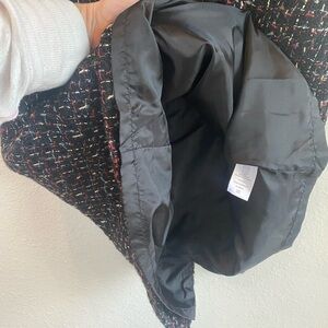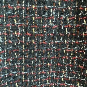 GUC, no flaws. Pretty tweed pattern, wool and cotton blend fabric. The black ribbon detail on waist and vertical create a nice shape.