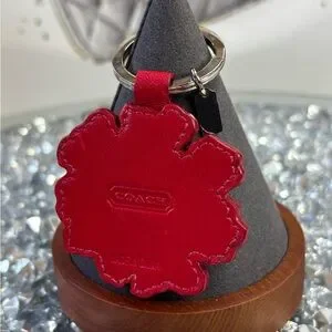 This item is a Coach Vintage Red Leather Hibiscus Keychain, part of the Coach Poppy collection. The design features a layered, embroidered leather flower inspired by poppy and hibiscus motifs that were prominent in Coach's Poppy line.